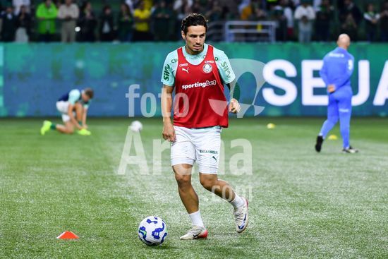 2837106 Raphael Veiga do Palmeiras durante aquecimento para a partida entre Palmeiras x Santos, válida pela trigésima segunda rodada do Campeonato Brasileiro de Futebol 2025, nesta quinta feira (6), no Allianz Parque, SP.