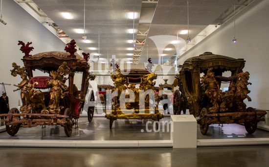 2814800 O Museu Nacional dos Coches, localizado em Lisboa, reúne uma coleção única no mundo de viaturas de gala e de passeio dos séculos XVI a XIX, na sua maioria provenientes da Casa Real Portuguesa, a que se acrescentaram veículos vindos dos bens da Igreja e de coleções particulares. Apresenta um excelente conjunto que permite ao visitante a compreensão da evolução técnica e artística dos meios de transporte de tração animal, utilizados pelas cortes europeias até ao aparecimento do automóvel. Na foto: Coche do Embaixador, Coche dos Oceanos e Coche da Coroação de Lisboa.