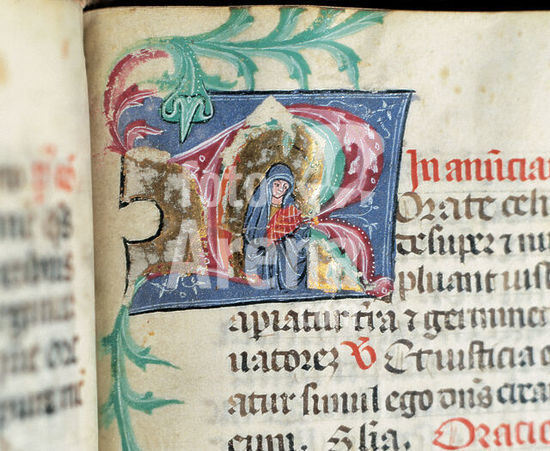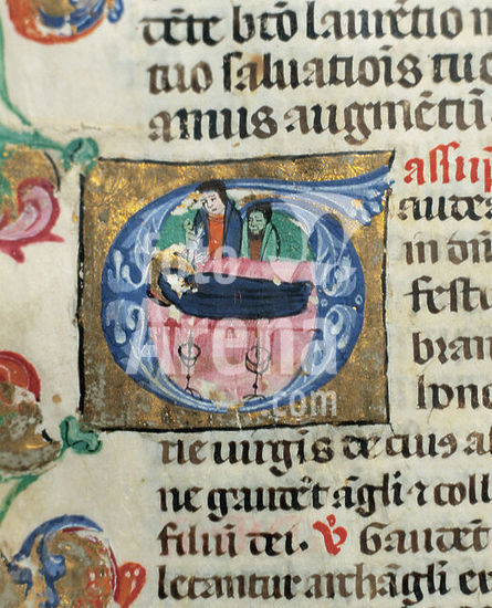alb1468521 Codex 135. Missale Dominicale cum Kalendario. 14th century. Miniature in the capital letter depicting the Dormition or death of the Virgin Mary and her spirit out of the body. Folio 129v. Chapter Archive of Tarazona. Spain.