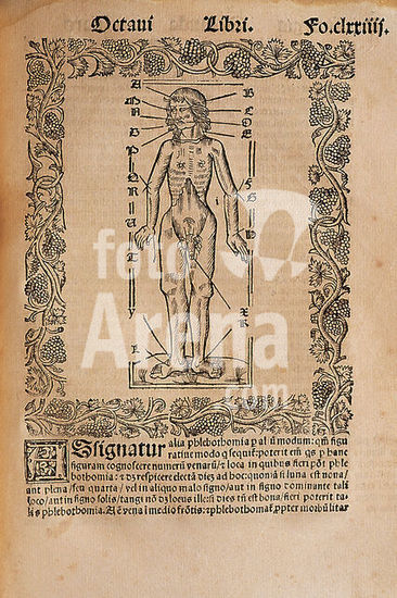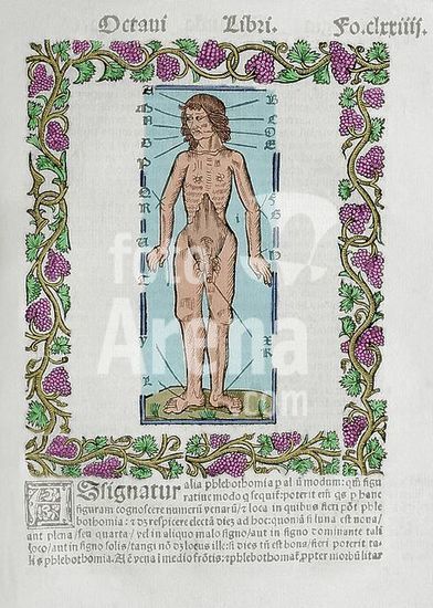 alb2956128 Ramon Llull (1235-1316). Spanish writer and philosopher. Practica Compendiosa Artis Raymundi Lulli, 1523. Book 8. Medicine subject. Engraving depicting the human body and the influence of the stars (the astrological associations of the human body). Colored engraving.