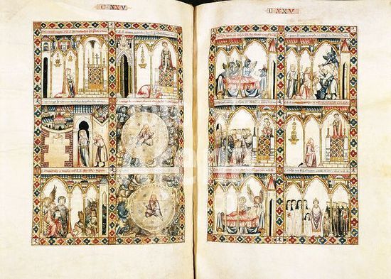alb1467371 The Cantigas de Santa Maria (Canticles of Holy Mary). Are 420 poems with musical notation, written in Galician-Portuguese during the reigh of Alfonso X El Sabio (1221-1284) and often attributed to him. Manuscript El Escorial. National heritage.
