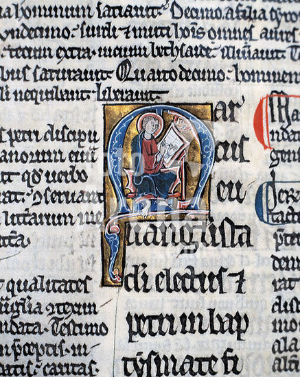 alb1473404 Codex 144. Biblia Novum Testamentum, Evangelia Santi Mathei et Santi Marci. Miniature of capital letter depicting Saint Mark with the gospel. 13th-14th centuries. Folio 119v. Chapter Archive of Tarazona. Spain.