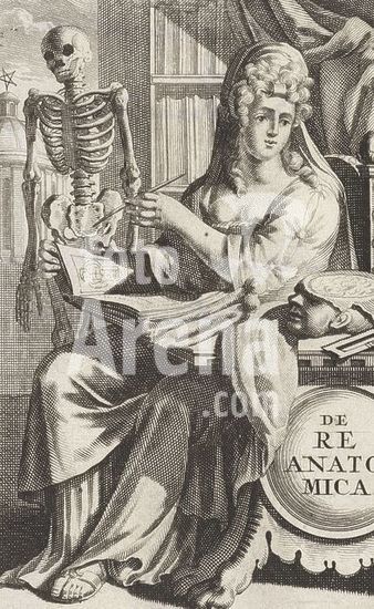 alb15544953 Utrecht, Schouten, Anthony, Hooghe, Romeyn de, Vianen, Jan van, Title page for: J. Munnicks, De re anatomica liber, 1697, Woman with a book near a human skeleton, a head and a bone, verso - stamped, A woman has a book on her lap with anatomical illustrations. Next to her on the table lies an open human head and a bone. Behind her a bookcase and a human skeleton., print, engraving, title page, prints, height 163 mm, width 103 mm, Northern Netherlands, 1680 - 1726, print maker, printmaker, 1697 - 1697, paper, etching, etchings, engraving (printing process), 1645-09-10 - 1708-06-15, intermediary draughtsman, after a drawing by, Publication (Event), Publication, publisher.