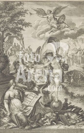 alb15546101 Leiden, Haak, Dirk (I), Bleyswijck, François van, Title page for: Marcus Iunianus Iustinus and Abraham Gronovius, Iustini Historiae Philippicae, 1719, Allegory of the victory over Macedonia, verso - stamped, In the foreground sits History with an open book with title. Behind her stands Minerva with a bust of Roma. On the right Fortuna balances on a globe, she laurells the bust. Father Time with an hourglass on his head stands behind the three women with a board with turbans and swords. In the air Fama blows a trumpet, in her hand she holds a portrait medallion. In the background on the right a burning city (possibly in the Macedonian monarchy), on the left an emperor sits under a canopy., print, engraving, title page, prints, engravings, height 162 mm, width 111 mm, Noord-Nederlands, 1671-05-24 - 1746-10-15, print maker, printmaker, 1719 - 1719, second quarter 18th century, tweede kwart 18e eeuw, third quarter 18th century, derde kwart 18e eeuw, paper, papier, engraving (printing process), Work conception, Northern Netherlands, after own design of, Publication (Event), Publication, publisher.