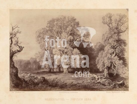 alb15548195 Munich, Fischbach, Johann, Germany, Bruckmann, Friedrich, Silberpappel - Populus Alba, Photographic reproduction of a drawing of white poplars, or silver poplars, in an open space in a forest, photograph, photo, reproduction, page, photos, photographically illustrated books, height 124 mm, width 180 mm, German, 1814 - 1898, photographer, 1865 - 1879, photographic paper, photo paper, albumen print, albumine print, Publication (Event), Publication, publisher, 1797-04-05 - 1871-06-19, intermediary draughtsman.