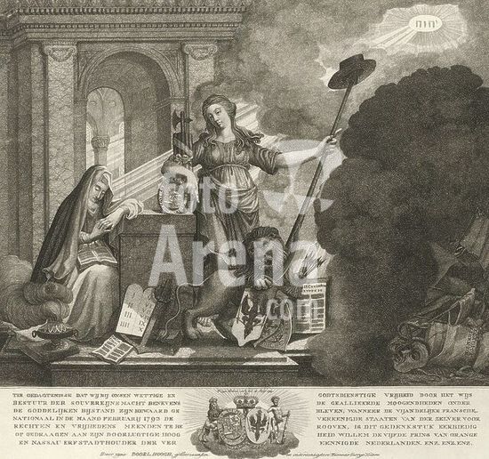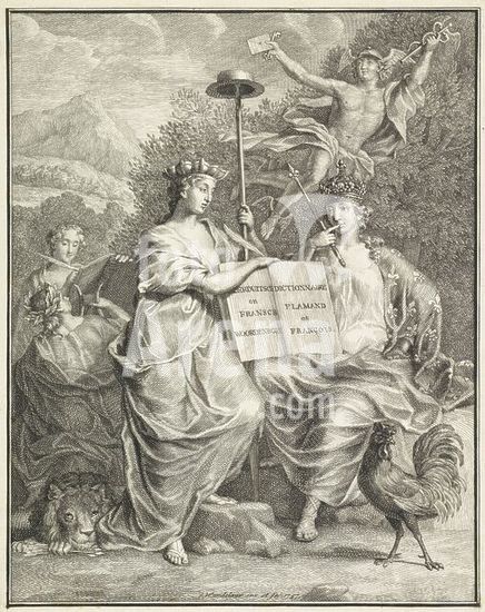 alb15562687 Noord-Nederland, Wandelaar, Jan, Title page for: Halma, François. Het groot Fransch en Nederduitsch woordenboek1761, Personificaties van de Oostenrijk-Nederlanden en Frankrijk, verso lower left - stamped, In the middle sits the personification of the Austrian Netherlands with a mural crown and a liberty staff with hat. She holds an open book with the abbreviated title. At her feet lies a lion with a arrow bundle. On the left behind her a woman plays a harp and another woman writes in a book. On the other side of the open book sits the personification of France with a crown, a scepter and a rooster at her feet. Behind them flies Mercury with his caduceus, an envelope and a key., print, engraving, title page, prints, height 222 mm, width 177 mm, Noord-Nederlands, 1690-04-14 - 1759-03-26, print maker, printmaker, 1757 - 1757, paper, papier, etching, engraving (printing process), Work conception, after own design by.