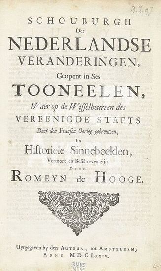 alb15598085 Title page for the Schouburgh of Dutch changes, opened in six tooneelen, 1674, Typographical title page for: Schouburgh of Dutch changes, opened in six tooneelen, written and published by Romeyn de Hooghe in 1674., publisher: Romeyn de Hooghe, (mentioned on object), Amsterdam, 1674, paper, letterpress printing, height, 282 mm × width, 190 mm.