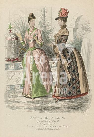 alb15761003 Revue de la Mode, Gazette de la Famille, 20 Novembre 1887, 16e Année, No. 829: Passementeries & Rubans (...), Two women in a conservatory, standing by an open birdcage on which a bird (parakeet?) sits. Left: 'toilette' made of light green velvet, pink surah and gold-colored braid, suitable for a young woman aged 18 to 20. Belt of light green velvet. Right: long coat of beige wool, wool with stripes and checks in beige, black and red. Feather collar. Beige wool cuffs. Bow made of beige ribbon with long slips, attached to the edge of the hood at the front. Below the performance are some lines of advertising text for various products. Print from the fashion magazine Revue de la Mode (1872-1913). Detailed description of the clothes on page 376 "PLANCHE COLORIÉE., print maker: anonymous, printer: Henri Quentin, Paris, 1887, paper, engraving, height c. 375 mm × width c. 268 mm.
