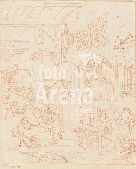 alb15763503 Newspaper reader in an interior, In an interior a man reads the newspaper and a woman feeds a child. A man leans on the opened bottom door. The printed drawing is loose in an album, see page 7., drawing, maker: Cornelis Ploos van Amstel, after drawing by: Adriaen van Ostade, Amsterdam, 1766, paper, height, 241 mm × width, 198 mm.