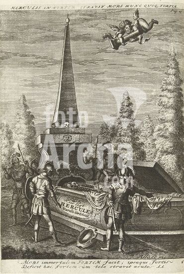 alb15763976 The opened grave of Hercules, ca. 1707-1708, Here lays Hercules 's Waerelds Sterkheid (title on object), The Steadfast Monarchy of Death, 't Pleasure Court of Momus (series title), Allegory in which bystanders see the skeleton in the opened grave of the god Hercules, ca. 1707-1708. Numbered: 6 and marked: Pag. 15. Part of: The Steadfast Monarchy of Death, a series of 8 old plates with verses adapted for use as cartoons on the French in the context of the War of the Spanish Succession. Part of the print work published under the collective title 't Lust-Hof van Momus with the bundled series of cartoons during the years 1701-1713 of the War of the Spanish Succession., print, print maker: Carel Allard, (possibly), Abraham Allard, (mentioned on object), publisher: Carel Allard, (mentioned on object), Amsterdam, 1707 - 1708, paper, etching, height, 315 mm × width, 200 mm.