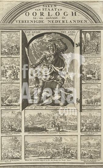 alb15764549 Title page for: L. Sylvius (u003d Lambert van den Bosch), Historien onses tyds, vol. 2, Matters of State and War, In and around the United Netherlands. from Anno 1678 to anno 1687 (title on object), Title page for: L. Sylvius (u003d Lambert van den Bosch), Historien onses tyds (1688). Open doors behind which a fierce warrior with torch and sword. Surrounded by 12 smaller scenes of war actions from the years 1678-1687, with captions., print, print maker: Jan Luyken, Northern Netherlands, (possibly), 1687 - 1688, paper, etching, engraving, height, 329 mm × width, 199 mm.