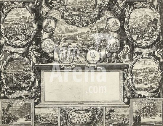 alb15768116 Victories of King William III in Ireland (bottom half), 1690, The Glorious Campaign of William the III King of Great Britain Neffen's Only Most Memorable Actions of the Allies and Confederates in the Year 1690 Event (title on object), Large print on two pages which celebrates the victories of King William III in Ireland and the victories of the Allies over France in the year 1690. Bottom half with the open box intended for the almanac of the battle at Naples surrounded by six tokens. On both sides smaller scenes of the battle between William III and James II in Ireland and between the Allies and France, on the right the conquest of Canada by the English., print, print maker: Daniel de Lafeuille, (mentioned on object), after own design by: Daniel de Lafeuille, (mentioned on object), Northern Netherlands, 1690 - 1691, paper, etching, height, 460 mm × width, 594 mm.