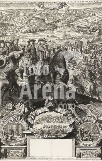 alb15768161 Capture of Luxembourg by the French, 1684, Les Actions Heroiques de Louis le Grand en l année MDCLXXXIV/ La Prize de Luxembourg par l'Armée du Roy, Commandée par Mr. le Ma.al de Crequi le 4 Juin 1684 (title on object), Conquest of Luxembourg by the French army under Marshal François de Créquy and the Marquis de Vauban on June 4, 1684. View of the siege of the city, in the foreground the French Marshal and other commanders on horseback. At the bottom smaller scenes, including the bombing of Genoa from June 17-28. At the bottom a cartouche left open intended for a calendar page for the year 1685. Two pages stuck together., print, print maker: Nicolas Langlois (I), (attributed to), publisher: Nicolas Langlois (I), (mentioned on object), Lodewijk XIV (koning van Frankrijk), (mentioned on object), Paris, 1684 - 1685, paper, etching, engraving, height, 872 mm × width, 568 mm.