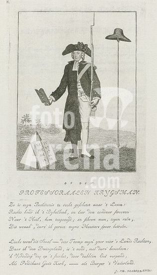 alb15770787 Patriotic preacher Johan Jacob le Sage ten Broek, 1785, Op den Professoraalen Krygsman (title on object), Performance in honor of the Rotterdam patriotic preacher and professor Johan Jacob le Sage ten Broek, ca. 1785. Ten Broek presented for one half as member of a free corps in uniform with a rifle and the other half as a preacher with a Bible in hand. Next to him a lance with a freedom hat. On the floor an open Bible on the book of Nehemiah. On the page under the plate two four-line verses. The print includes a text sheet with more verses., print, print maker: anonymous, J.Ph. Hildebrand, (mentioned on object), Northern Netherlands, 1785, paper, etching, engraving, letterpress printing, height, 385 mm × width, 252 mm.
