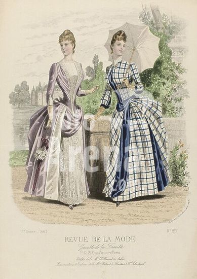 alb15771064 Revue de la Mode, Gazette de la Famille, dimanche 14 August 1887, 16e Année, No. 815: Etoffes de la M.on Le Houssel (...), Two women at a balustrade, an estate in the background. Left: 'toilette' of white silk, white lace, purple wool and mother-of-pearl buttons. Bodice of wool opened on a vest of white silk decorated with mother-of-pearl buttons. Collar of white silk covered with lace. Right: 'toilette' of light gray wool with navy blue check and navy blue surah. Short coat of wool opened on a draped 'plastron' of surah; belt made of the same fabric. Below the performance are some lines of advertising text for various products. Print from the fashion magazine Revue de la Mode (1872-1913). Detailed description of the clothing on page 260 "PLANCHE COLORIÉE"., print maker: anonymous, printer: Henri Quentin, Paris, 1887, paper, engraving, height c. 368 mm × width c. 257 mm.