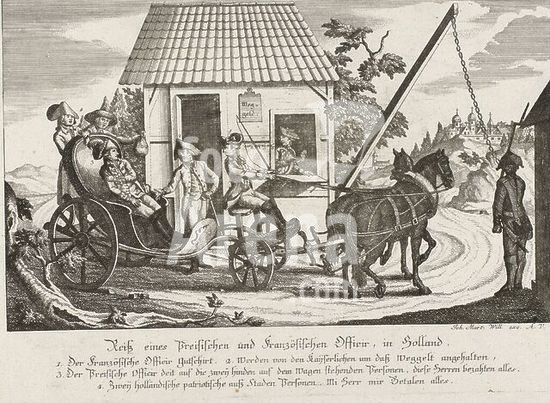 alb15771163 Cartoon on the peace between the Netherlands and the Emperor, 1785, Reiß eines Preisischen und Französischen Officir, in Holland (title on object), Cartoon on the Treaty of Fontainebleau that ended the Cauldron War, the disputes between the Netherlands and the Austrian Emperor Joseph II, November 8, 1785. The Netherlands paid 8.5 million guilders and accepted other humiliating terms. On the left an Austrian toll tree with an open carriage, driven by a French officer, in which a Prussian officer sits; the officer is stopped by the Austrian official for payment of barrier money, but the two Dutch lackeys standing at the back of the carriage say: we will pay everything so that the Prussian can continue his journey. In the caption the legend 1-4 in German., print, print maker: anonymous, publisher: Johann Martin Will, (mentioned on object), print maker: Germany, publisher: Augsburg, 1785 - 1786, paper, etching, engraving, height, 215 mm × width, 345 mm.