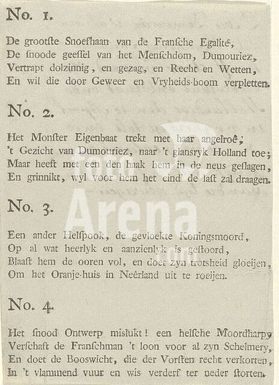 alb15771324 Text page for the opening cartoon on Dumouriez, 1793, Text page for the opening cartoon on the fall of General Charles François Dumouriez. Four verses numbered No. 1-4. With handwriting on verso., text sheet, printer: anonymous, Northern Netherlands, 1793, paper, letterpress printing, height, 165 mm × width, 120 mm.