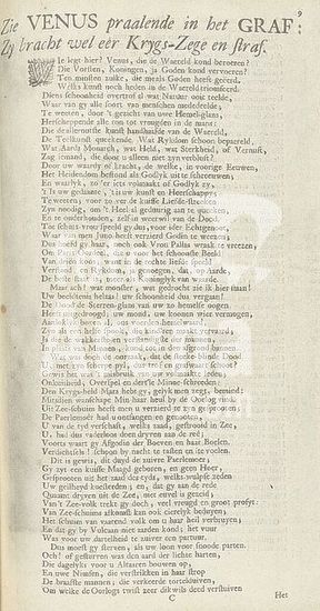 alb15772581 Verse with the print with the opened grave of Venus, ca. 1707-1708, See Venus resplendent in the grave: She did bring honor, victory and punishment (title on object), The Steadfast Monarchy of Death, 't Pleasure Garden of Momus (series title), Text sheet with a verse on both pages belonging to the print with the allegory in which bystanders view the skeleton in the open tomb of the goddess Venus, ca. 1707-1708. Part of: The Steadfast Monarchy of Death, a series of 8 old plates with verses adapted for use as cartoons on the French in the context of the War of the Spanish Succession. Part of the print work published under the collective title 't Lust-Hof van Momus with the bundled series of cartoons during the years 1701-1713 of the War of the Spanish Succession., text sheet, Abraham Allard, publisher: Carel Allard, Amsterdam, 1707 - 1708, paper, letterpress printing, height, 315 mm × width, 200 mm.