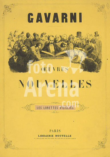 alb15861293 Album with representations of old Lorettes, Gavarni. Oeuvres Nouvelles. Les Lorettes vieillies (title on object), Old women from Notre-Dame-de-Lorette in Paris (series title), Masques et visages. Les Lorettes vieillies (series title), Album with ten prints on ten pages. On the cover, a print collector opens an album. He is surrounded by various human figures., print maker: Paul Gavarni, printer: Joseph Rose Lemercier, printer: Imprimerie Raçon, Paris, 1853, paper, height 384 mm × width 278 mm × width 542 mm.
