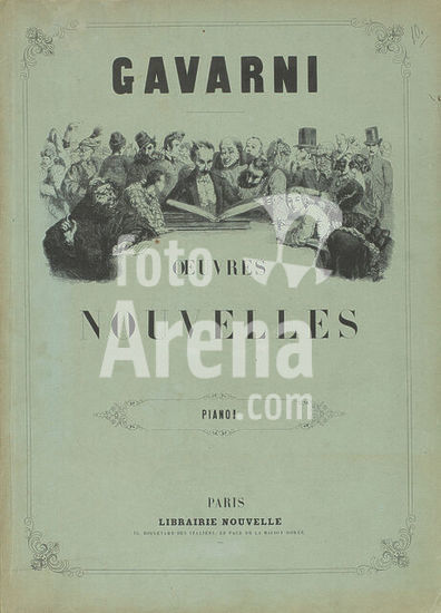 alb15865418 Album with representations of people playing the piano, Gavarni. Oeuvres Nouvelles. Piano! (title on object), Piano playing (series title), Masques et Visages. Piano! (series title), Album with ten prints on ten pages. On the cover, a print collector opens an album. He is surrounded by various human figures., print maker: Paul Gavarni, printer: Joseph Rose Lemercier, printer: Imprimerie Raçon, Paris, 1853, paper, height 378 mm × width 275 mm × width 532 mm.