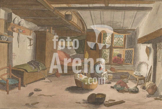 alb15938566 Interior with a woman at a cradle, Interior with a woman at a cradle. The woman talks to a man standing outside the open window. A child is playing by the fireplace. The print is loose in an album, see page 56., print maker: Cornelis Ploos van Amstel, (signed by artist), after drawing by: Adriaen van Ostade, Amsterdam, 1768, paper, height 134 mm × width 198 mm, print.