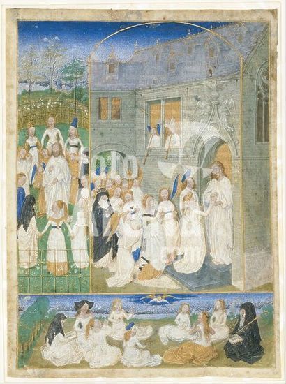 alb3623258 The Holy Virgins Greeted by Christ as They Enter the Gates of Paradise. Artist: Simon Marmion (French, Amiens ca. 1425-1489 Valenciennes). Dimensions: 6 1/4 x 4 9/16 in. (15.8 x 11.6cm)Painted Area: 5 15/16 x 4 5/16 in. (15.1 x 11cm)Justification: 4 3/16 x 2 13/16 in. (10.7 x 7.1cm). Date: ca. 1467-70.This miniature, depicting the Holy Virgins being greeted by Christ at the gates of paradise, was originally part of a breviary, which is a book containing the Divine Office for recitation on each day of the Roman Catholic calendar. The image would have faced the opening lines of the text for the Common of Virgins. The location and orientation of the image within the book is confirmed by the text on the back of this miniature, which is the end of the Common of Confessors--a section that traditionally precedes the Common of Virgins. Marmion has divided the leaf into three scenes, each of which illustrates part of the text of the Common of the Virgins. Among the figures in all three scenes is the abbess of a religious order, identifiable by her black habit, whose identity and meaning have yet to be unraveled.This book must have been lavishly illustrated, since full-page miniatures in the Common of Saints section, like this one, were rare. The generous use of gold leaf further underscores the expense of the original manuscript, which was begun for Philip the Good, duke of Burgundy, in 1467, and finished in 1470 for Charles the Bold, Philip's son and successor. A surviving document indicates that the manuscript had 624 folios, 95 miniatures, and was illustrated for the ducal court by Simon Marmion and his workshop. This breviary was one of a number of works undertaken by Marmion, one of the most esteemed illuminators and painters of his generation. Museum: Metropolitan Museum of Art, New York, USA.