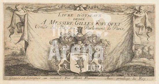 alb3684207 Title Page: Livre d'Oyseaux (Book of Birds). Artist: Albert Flamen (Flemish, born ca. 1620, active 1648-88). Dimensions: Sheet: 4 x 7 15/16 in. (10.2 x 20.2 cm). Series/Portfolio: Livre d'Oyseaux (Book of Birds). Date: 1655-1660. Museum: Metropolitan Museum of Art, New York, USA.