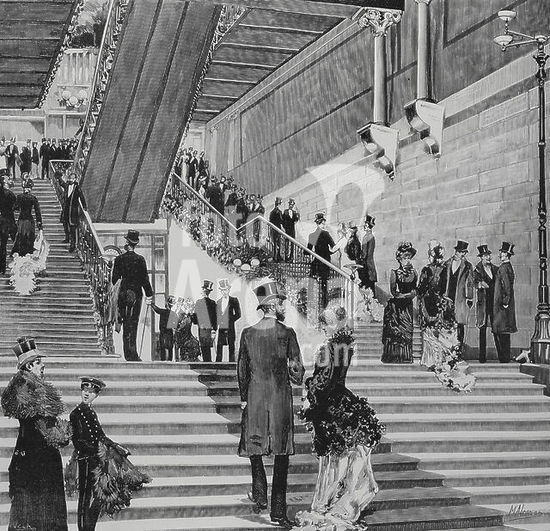 alb4313318 History of Spain. Ateneo de Madrid. Interior of the modernist building in Calle del Prado, designed by the architects Enrique Fort and Luis Landecho. Aspect of the main staircase on the night of 31 January 1884, when the building was inaugurated by Antonio Cánovas del Castillo. Engraving by Vela. La Ilustración Española y Americana (The Spanish and American Illustration), February 8, 1884. Author: Manuel Alcázar Ruiz (1858-1914). Spanish artist. Eugenio Vela (d. 1895). Spanish engraver.
