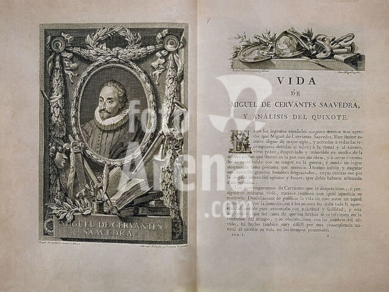 orz014132 Don Quixote. 1st page of Joaquin de Ibarra's first edition in 1780 - life of Miguel de Cervantes. Madrid, National library. Author: MIGUEL DE CERVANTES SAAVEDRA. Location: BIBLIOTECA NACIONAL-COLECCION. MADRID. SPAIN. MIGUEL DE CERVANTES SAAVEDRA (1547-1616).
