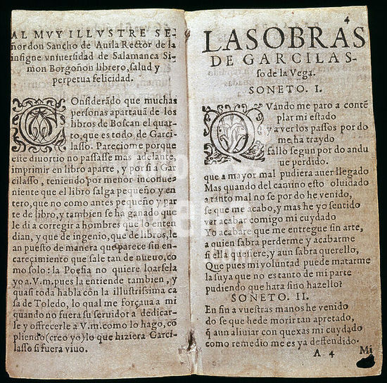 orz015309 Works. 16th century. Edition by Alonso de la Barrera in 1580 in Seville. Spanish literature of the Golden Century. Madrid, National Library. Author: GARCILASO DE LA VEGA (1491/1503-1536). Location: BIBLIOTECA NACIONAL-COLECCION. MADRID. SPAIN.