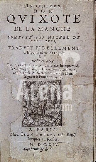 orz036176 Cover of the French edition of Don Quixote in 1614. Portada de la edicion francesa de 1614 del Quijote. Madrid, National Library. Author: MIGUEL DE CERVANTES SAAVEDRA. Location: BIBLIOTECA NACIONAL-COLECCION. MADRID. SPAIN.