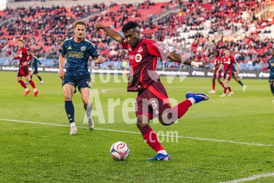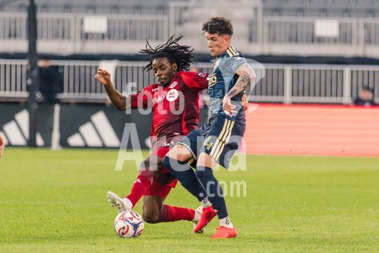 2930181 Richie Laryea, do Toronto FC, disputa a bola com Danley Jean Jacques, do Philadelphia Union, durante a partida da temporada regular da MLS entre Toronto FC e Philadelphia Union, no BMO Field, em 22 de abril de 2026, em Toronto, Ontario, Canada. (Curtis Wong / SPP)