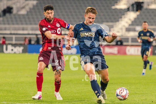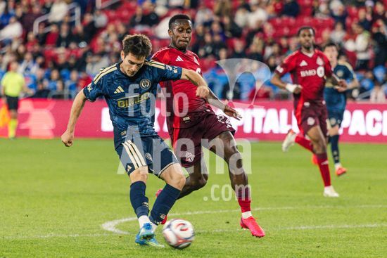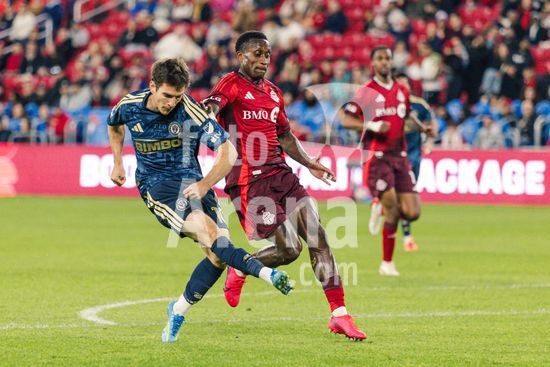 2930180 Bruno Damiani, do Philadelphia Union, disputa a bola com Jonathan Osorio, do Toronto FC, durante a partida da temporada regular da MLS entre Toronto FC e Philadelphia Union, no BMO Field, em 22 de abril de 2026, em Toronto, Ontario, Canada. (Curtis Wong / SPP)