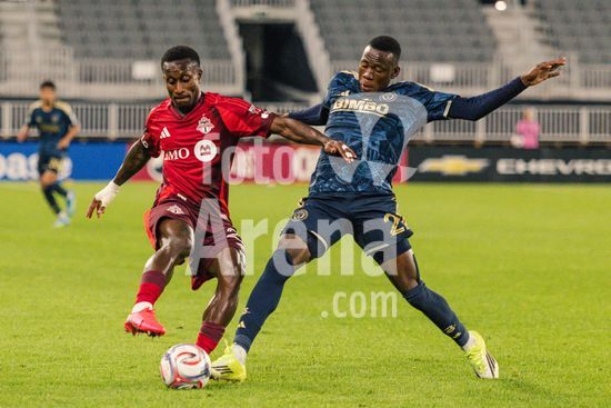 2930177 Deandre Kerr, do Toronto FC, e Jovan Lukic, do Philadelphia Union, em acao durante a partida da temporada regular da MLS entre Toronto FC e Philadelphia Union no BMO Field, em 22 de abril de 2026, em Toronto, Ontario, Canada. (Curtis Wong / SPP)