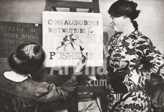 902_05_12285653HighRes A young girl during World War One painting a recruitment poster which reads " Come along boys, don't wait to be pushed" From The Pageant of the Century, published 1934