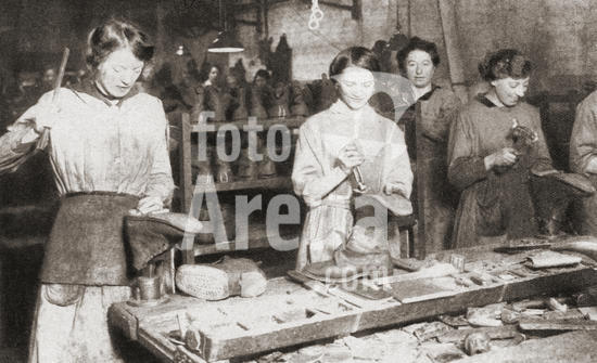 902_05_12285929HighRes Women took over many men's jobs during World War One, thereby leaving the men free to fight. Seen here women making army boots wearable by heel building or re-soling. From The Pageant of the Century, published 1934