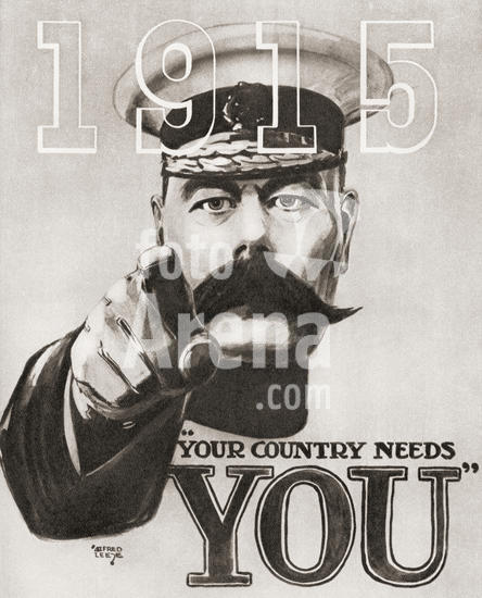 902_05_12288401HighRes The British wartime recruitment poster depicting Lord Kitchener with the words "Your Country Needs You" and the date 1915. From The Story of 25 Eventful Years in Pictures published 1935