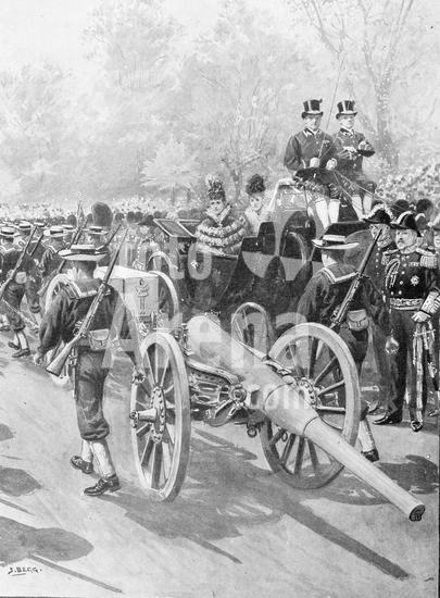 902_05_12452336highres Illustrated London News record of Transvall War 1899-1900. The achievements of the home and colonial forces in the great conflict with the Boer Republics. Spencer Wilkinson record. Bluejackets gun detachment from Ladysmith passing the Prince and Princess of Wales at the Horse Guards.