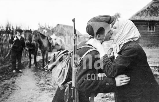975_05_SOV-B-11255 World war 2, a russian partisan in the leningrad region kissing his mother good-bye before leaving with his detachment.