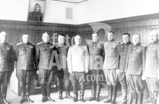 975_05_SOV-B-18003 Front commanders at the end of great patriotic war (1941-1945), from right to left: i,s, konev, f,i, tolbukhin, a,m, vasileysky, r,y, malinovsky, g,k, zhukov, l,n, govorov, k,k, rokossovsky, a,i, yeremenko, k,a, meretskov and i,h, bagramyan.