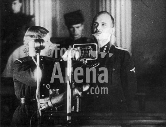 975_05_SOV-B-KH22 World war 2, december 15, 1943, still from a film on the kharkov trial produced by artkino, hans ritz pleads guilty, the woman is the court translator.