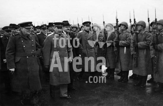 975_05_SOV-B-N626 Moscow conference, winston churchill, stalin, and molotov passing an honor guard prior to the departure of the british delegation.