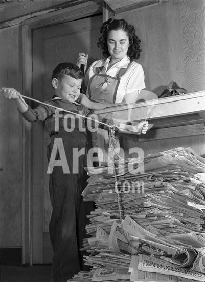 990_16_4-WWII-US-HF-D_10HR United States: February, 1942. A patriotic boy who is doing his part for the home front war effort, ties a rope around a pile of newspaper for recycling.