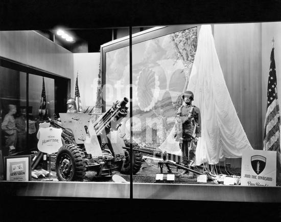 990_16_AG4-WWII-US-HF-D_4HR Minneapolis, Minnesota: June 12, 1944. Less than a week after D-Day, President Roosevelt calls upon the country to purchase Treasury bonds as part of the 5th War Loan drive. The Dayton Company, a major department store, has a window display supporting the drive, and is also the sponser of the Army Show featuring the 'This Is The Army, Mrs. Jones', display of war material.