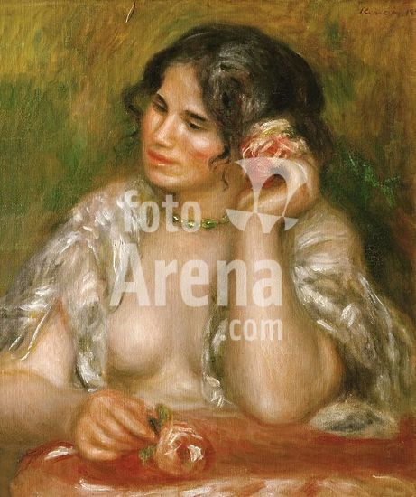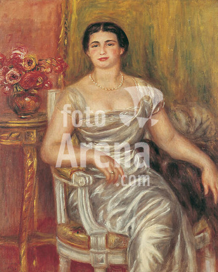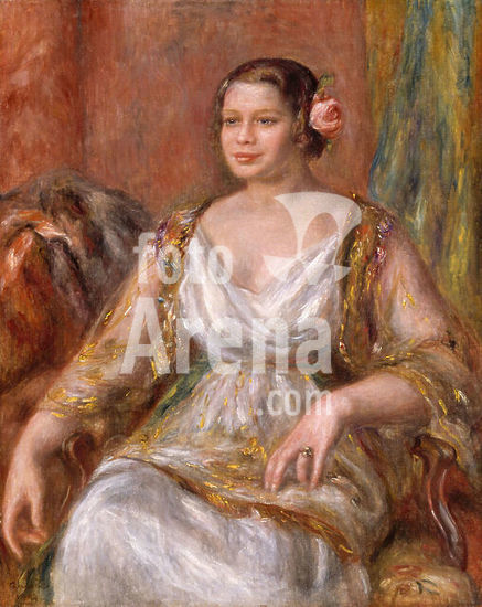 alb3645587 Tilla Durieux (Ottilie Godeffroy, 1880-1971). Artist: Auguste Renoir (French, Limoges 1841-1919 Cagnes-sur-Mer). Dimensions: 36 1/4 x 29 in. (92.1 x 73.7 cm). Date: 1914.In July 1914, just prior to the outbreak of World War I, the famous German actress Tilla Durieux traveled to Paris with her husband, the art dealer Paul Cassirer, to pose for Renoir. The classicizing, pyramidal format of this composition lends a certain grandeur to the sitter, attired in the costume that the couturier Poiret designed for her role as Eliza Doolittle in George Bernard Shaw's Pygmalion in 1913. When Renoir painted this ambitious portrait, he was so crippled with arthritis that he had to sit in a wheelchair with his brush strapped to his hand. Museum: Metropolitan Museum of Art, New York, USA. Author: AUGUSTE RENOIR.
