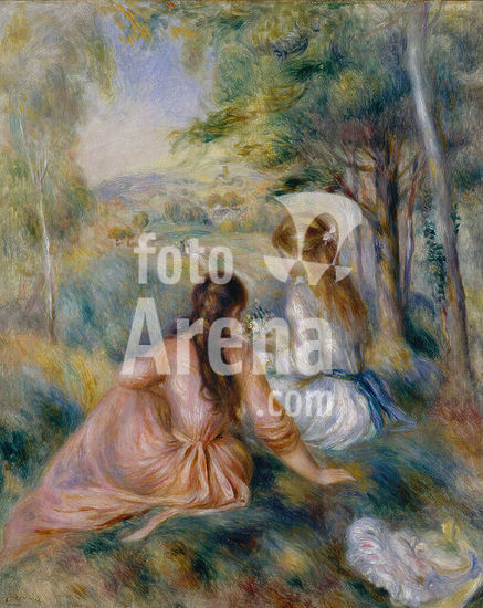 alb3608672 In the Meadow. Artist: Auguste Renoir (French, Limoges 1841-1919 Cagnes-sur-Mer). Dimensions: 32 x 25 3/4 in. (81.3 x 65.4 cm). Date: 1888-92.Between 1888 and 1892 Renoir painted a number of works in which the same pair of girls--the blonde wearing a white frock and the brunette a pink one--engage in leisurely pastimes. Here, they pick flowers; the same models appear at the piano in a painting now in the Museum's Lehman Collection (1975.1.201). These intimate genre scenes, which celebrate youthful innocence, found a ready market in the early 1890s. Museum: Metropolitan Museum of Art, New York, USA. Author: AUGUSTE RENOIR.