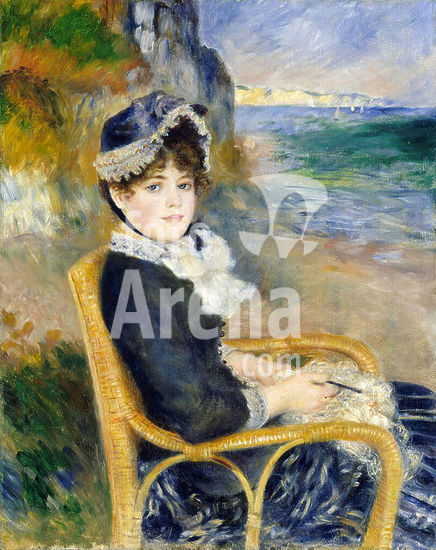 alb3613675 By the Seashore. Artist: Auguste Renoir (French, Limoges 1841-1919 Cagnes-sur-Mer). Dimensions: 36 1/4 x 28 1/2 in. (92.1 x 72.4 cm). Date: 1883.Renoir likely painted this work in his studio, posing his model and future wife, Aline Charigot, in a wicker chair. The beach behind her probably represents the Normandy coast near Dieppe. This canvas reflects the impact of Renoir's trip to Italy in 1881-82, which inspired him to unite the "grandeur and simplicity" he admired in Renaissance art with the luminosity of Impressionism. His new approach, which he called his "dry" manner, is evident in Aline's face, with its carefully drawn features and smooth handling of paint. The medley of quick strokes in the background, however, displays the freer technique of Renoir's earlier years. Museum: Metropolitan Museum of Art, New York, USA. Author: AUGUSTE RENOIR.