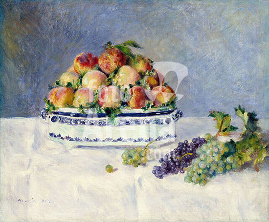 alb3616116 Still Life with Peaches and Grapes. Artist: Auguste Renoir (French, Limoges 1841-1919 Cagnes-sur-Mer). Dimensions: 21 1/4 x 25 5/8 in. (54 x 65.1 cm). Date: 1881.Renoir spent part of the summer of 1881 at the country home of his patron Paul Berard in the small Normandy village of Wargemont. During his stay, Renoir painted two similar still lifes in contrasting color harmonies, showing the family's faïence jardinière piled high with peaches. Berard purchased the present work for himself; the other version (61.101.12) was featured in the seventh Impressionist exhibition the following year. Museum: Metropolitan Museum of Art, New York, USA.