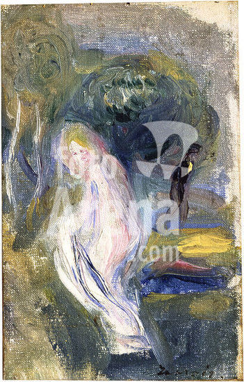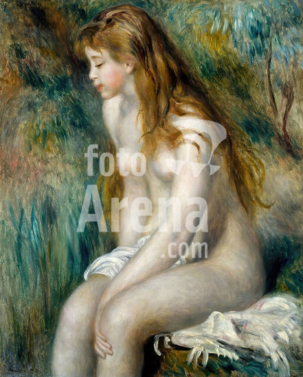 alb3626169 Young Girl Bathing. Artist: Auguste Renoir (French, Limoges 1841-1919 Cagnes-sur-Mer). Dimensions: 32 x 25 1/2 in. (81.3 x 64.8 cm). Date: 1892.Pierre Auguste Renoir painted a great many canvases of single bathers in outdoor settings, timeless studies of fulsome young women. In the Lehman painting, his model averts her glance, seated in shy three-quarter profile. Innocent yet sensual, this charming nude would have pleased Renoir's audience in the later nineteenth century. The picture is thinly painted, its brushwork soft and supple. Renoir probably posed his model in the studio, since the rapidly brushed landscape background is far more imaginary than real. Claude Monet first owned this painting, and remarked to a friend that while the nude was beautiful, the landscape was conventional. Renoir clearly concentrates his brush on the undulating physiognomy of his innocent auburn-haired model. Museum: Metropolitan Museum of Art, New York, USA.