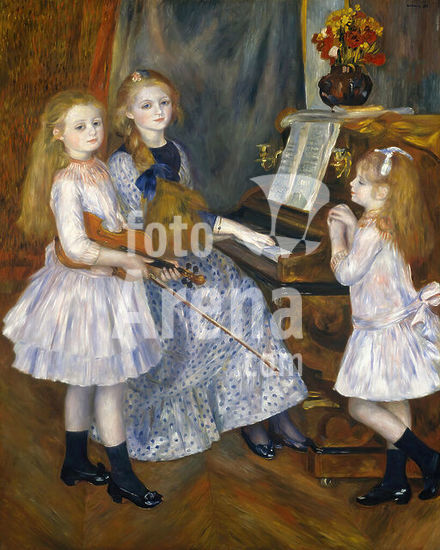 alb3654055 The Daughters of Catulle Mendès, Huguette (1871-1964), Claudine (1876-1937), and Helyonne (1879-1955). Artist: Auguste Renoir (French, Limoges 1841-1919 Cagnes-sur-Mer). Dimensions: 63 3/4 x 51 1/8 in. (161.9 x 129.9 cm). Date: 1888.Hoping to recapture the success he had achieved with Madame Georges Charpentier and Her Children (07.122) at the Salon of 1879, Renoir sought to paint the daughters of his friend Catulle Mendès. In addition to the girls' manifest charm, he undoubtedly counted on the notoriety of their bohemian parents to gain attention: their father was a Symbolist poet and publisher, and their mother was the virtuoso pianist Augusta Holmès. Renoir completed the commission in a matter of weeks and immediately exhibited the large canvas in May 1888, but the response to his new manner of painting, with its intense hues and schematized faces, was unenthusiastic. Museum: Metropolitan Museum of Art, New York, USA. Author: AUGUSTE RENOIR.